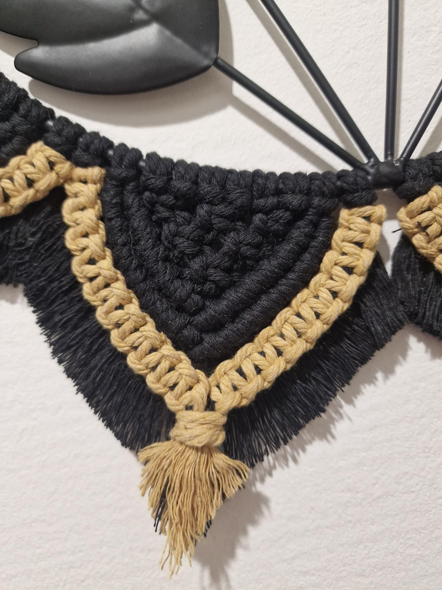 Réalisée sur un cercle en métale de 25 cm avec du fil en coton de 3mm pour un dimension finale de 45cm.