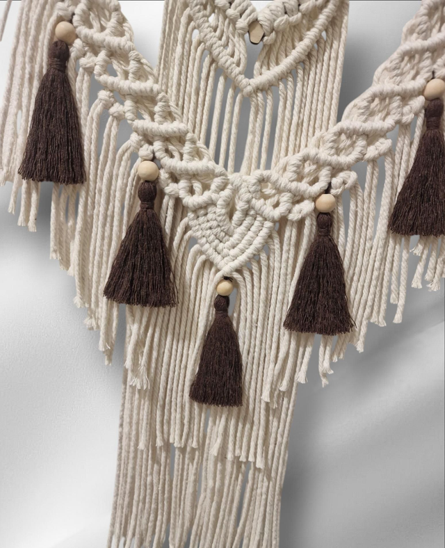 Les matériaux utilisés sont généralement des fils en coton, lin ou jute, ce qui confère à la décoration un aspect naturel et authentique. Les décorations murales en macramé sont idéales pour apporter une touche artisanale et un esprit relaxant à n'importe quelle pièce, en particulier dans des salons, chambres ou espaces de méditation.